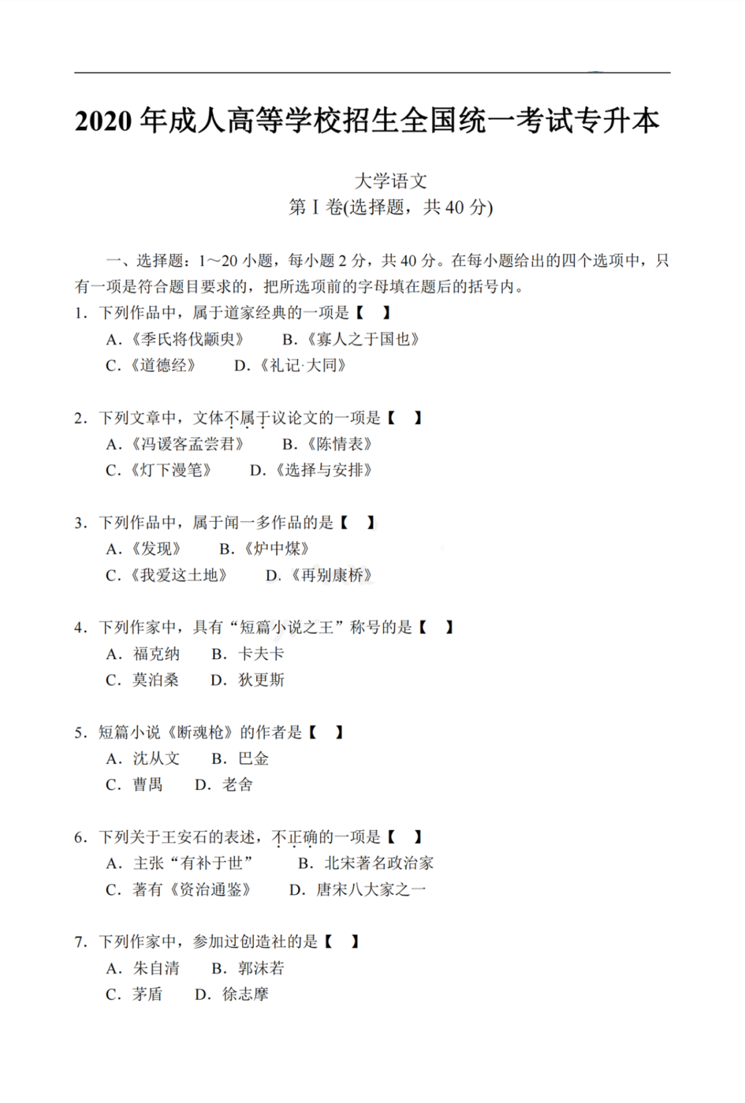 2020年贵州成人高考专升本《大学语文》真题及答案解析详解